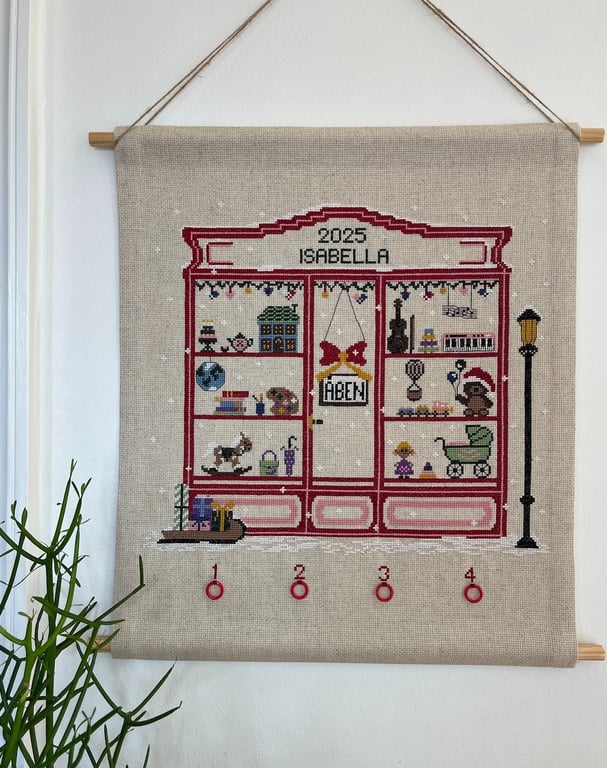 En sjov og hyggelig adventskalender med friske farver, der broderes på det smukke rustikke Aida ,med 5,4 sting pr. cm. Det giver et elegant og moderne look. På denne kalender er der mange detaljer og meget at kigge på for børn og voksne, med de mange fine legeting. Her er et dukkevogn, jordklode, klaver, violin, en bamse, en luftballon, gaver, kælk, malerpensler dukke, te selskab, taske og gyngehest.